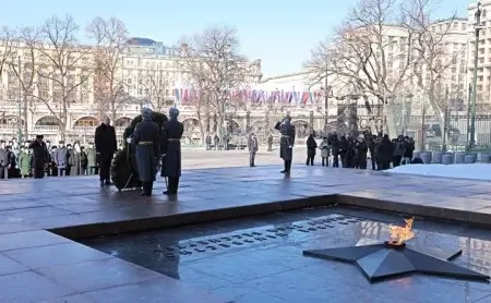 В День защитника Отечества Владимир Путин почтил память погибших воинов, возложив венок к Могиле Неизвестного Солдата у Кремлёвской стены и цветы – к обелискам городов-героев и памятному знаку в честь городов воинской славы.