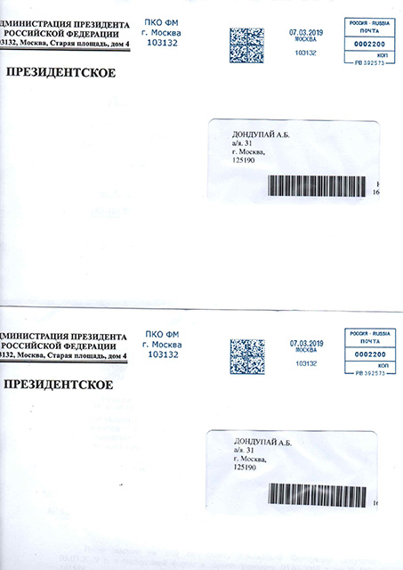 14 марта 2019г. в адрес Председателя правления Центра А.Б. Дондупай поступили письма от Администрации Президента Российской Федерации за исх. № А26-01-НО-16159191, № А26-01-НО-16158871 от 05.03. 2019г. о том, что информация, изложенная в экспертизе изучена уполномоченными органами власти.